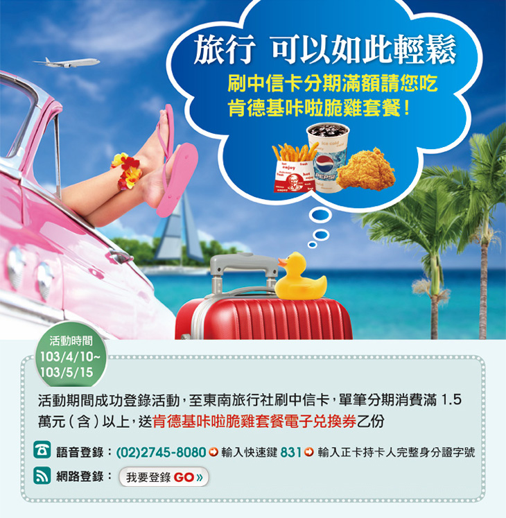 - 單筆分期滿額送肯德基咔啦脆雞套餐電子兌換券活動須信用卡正卡持卡人於103/4/10~103/5/15成功完成登錄始符合資格,分期消費日須介於103/4/10~103/5/15,且商店須於103/5/30前完成請款入帳(不含退貨、取消交易)。