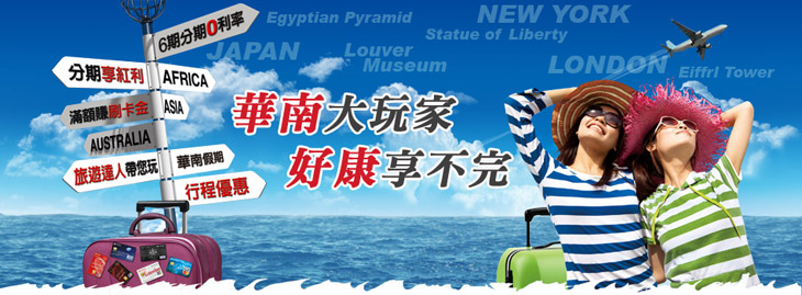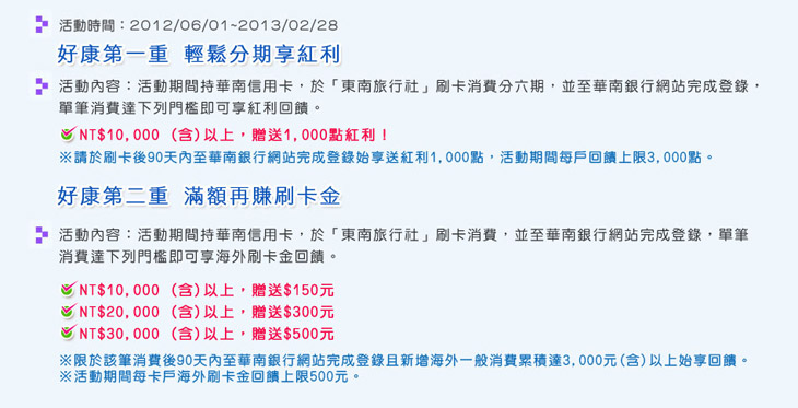 - 「輕鬆分期享紅利」活動限於東南旅遊現場或網上刷華南銀行信用卡1萬元(含)以上申請6期分期成功,並於90天內至華南銀行網站完成登錄始得享有。加贈之紅利點數1,000點,將於分期成功並登錄後次月起依持卡人帳單週期回饋至正卡持卡人信用卡帳上。活動期間每卡戶回饋上限3,000點。(華南旅鑽商務御璽卡恕不適用輕鬆分期享紅利活動)